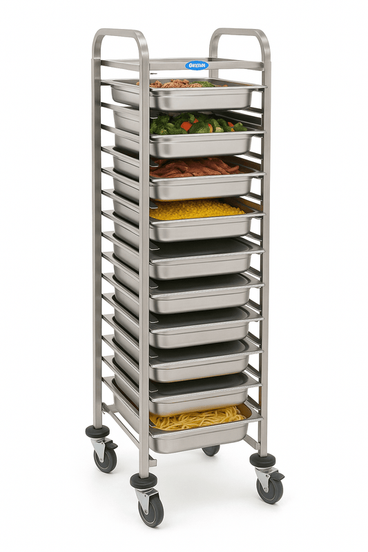 Onze Regaalwagens zijn verkrijgbaar in zowel GN- als Bakerynorm-maten en bieden flexibele opties voor het veilig vervoeren van dienbladen, pannen en ingrediënten. Deze wagens zijn essentieel voor keukens en bakkerijen en zorgen voor een snelle en veilige verplaatsing van grote hoeveelheden voedsel en benodigdheden.